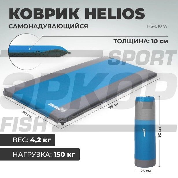 Коврик туристический самонадувающийся обеспечивает максимальный уровень комфорта и теплоизоляции во время многодневного кемпинга. Сверхмягкий, благодаря своей толщине является прекрасной альтернативой надувным кроватям, скроет любые неровности в виде камней или корней под полом палатки. Упругий наполнитель из вспененного материала сглаживает мелкие неровности поверхности и обеспечивает комфортный сон. Плотный материал верха и полностью проклеенные швы гарантируют долговечность. Сложенный коврик надувной туристический можно стянуть резинками и убрать в чехол. Антискользящее покрытие на нижней стороне коврика препятствует стремлению ковров расползаться по палатке. Вспененный полиуретан обеспечивает прекрасную теплоизоляцию и упругость характерную для ортопедических матрасов. Размеры: 195x90x10 см. Размер в чехле: 92х25 см. Допустимая нагрузка: до 150 кг. Вес: 4,2 кг. Коврик самонадувающийся Helios это прекрасный подарок на День Рождения туристу, рыбаку, охотнику.