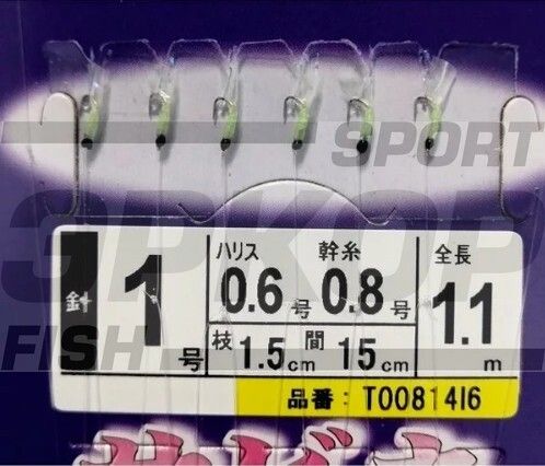 Самодур Hayabusa Custom T00814I6 крючок #1, поводок 0.128мм, леска 0.148мм, длина 1.10м. Шесть серебристых крючков с зеленым мобискином и черной бусиной.