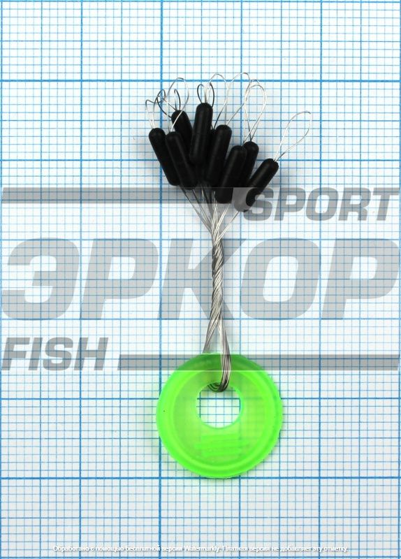 Силиконовые стопоры выполнены в форме эллипсоида белого цвета, смонтированы на монолеске. При монтаже леска пропускается в петлю, после чего стопор перетягивается на неё. В пачке 18 стопоров.